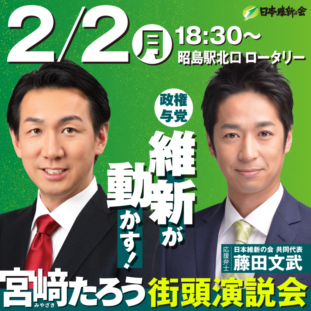 急なご案内となりますが、明日、宮﨑たろうの応援のために、日本維新の会の藤田文武共同代表が昭島に応援にかけつけてくださることになりました!