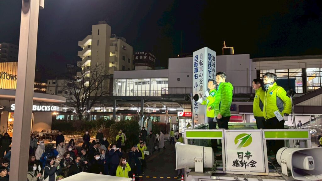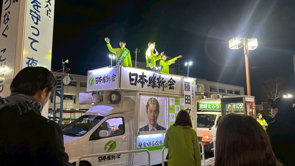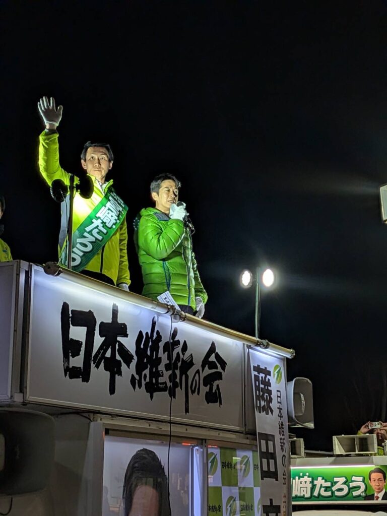 2月2日(月)、藤田文武共同代表が宮﨑たろうの応援のために、前の応援場所の長野県から、昭島入りされました。